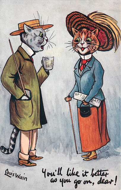 Wain’s kitschy, fanciful illustrations depicted a world in which cats walked upright like humans, often wore human clothes, went shopping, met in pubs and mingled with high society, draped in finery. In Wain’s world, cats no longer had “weaselly faces and ratty tails” – instead, their faces were cuter, their eyes rounder and their tails fluffier than their real-world counterparts.